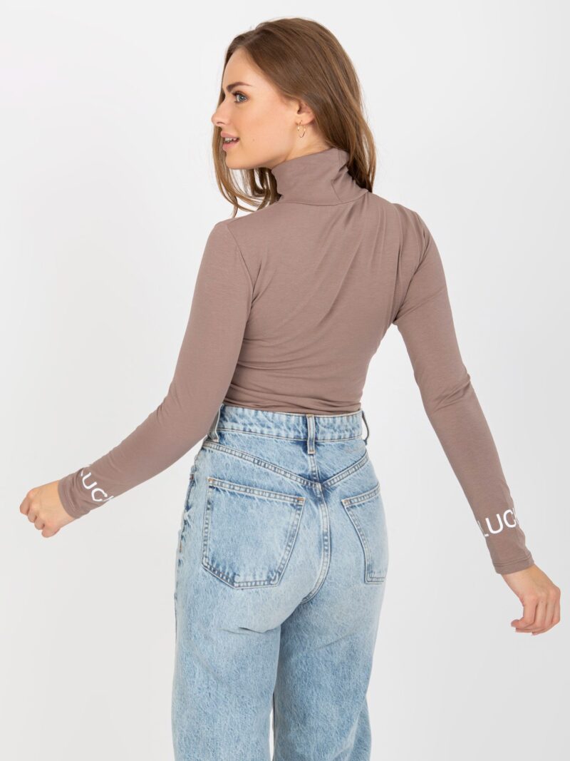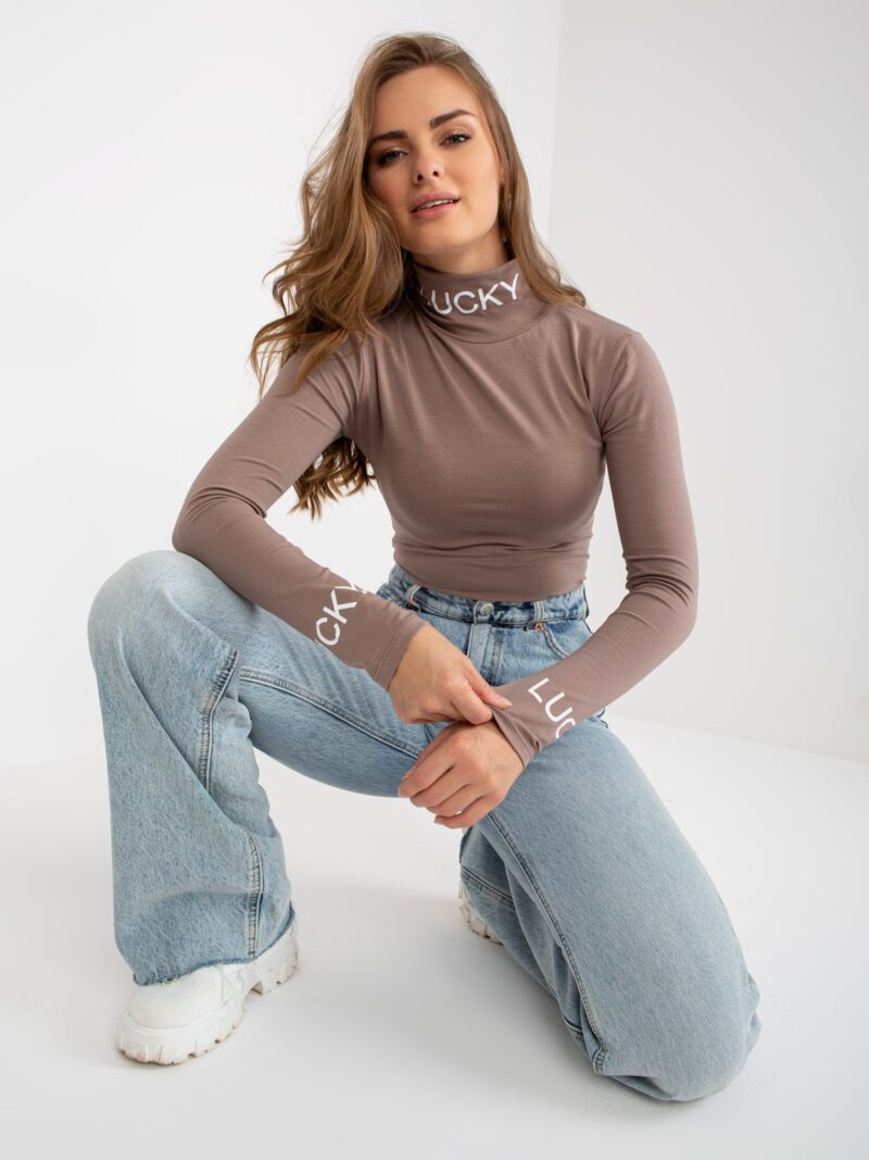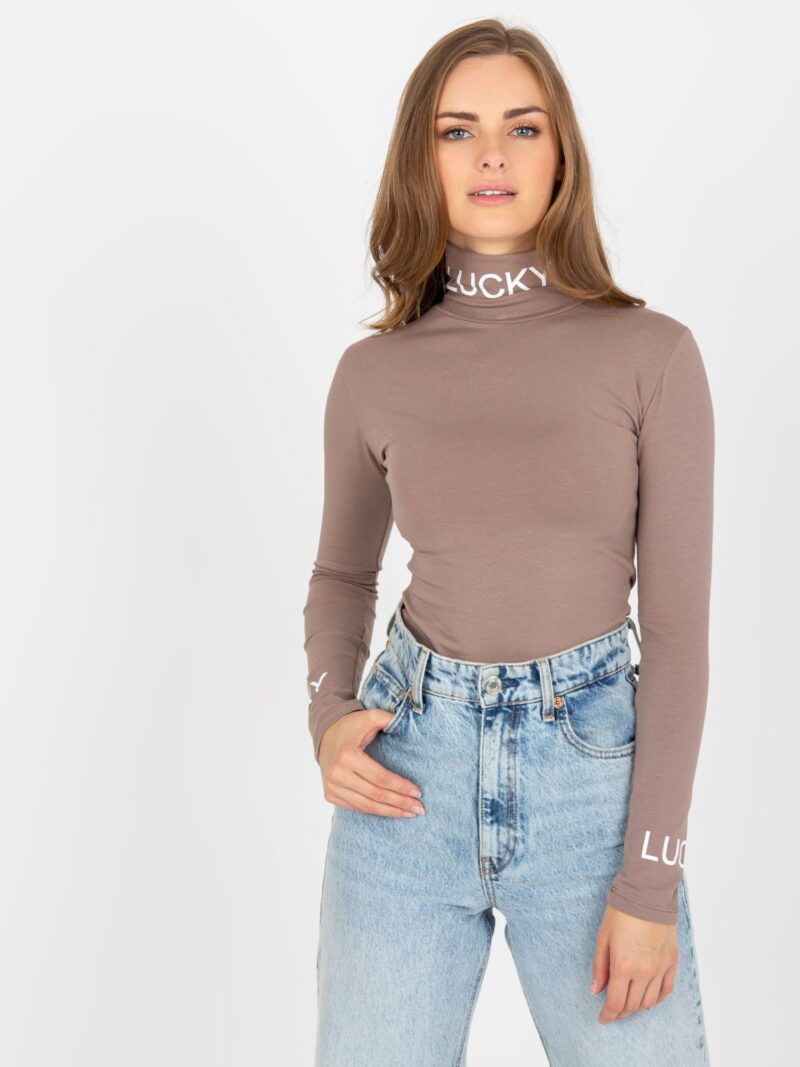 Beżowy golf damski z napisem Lucky i długim rękawem