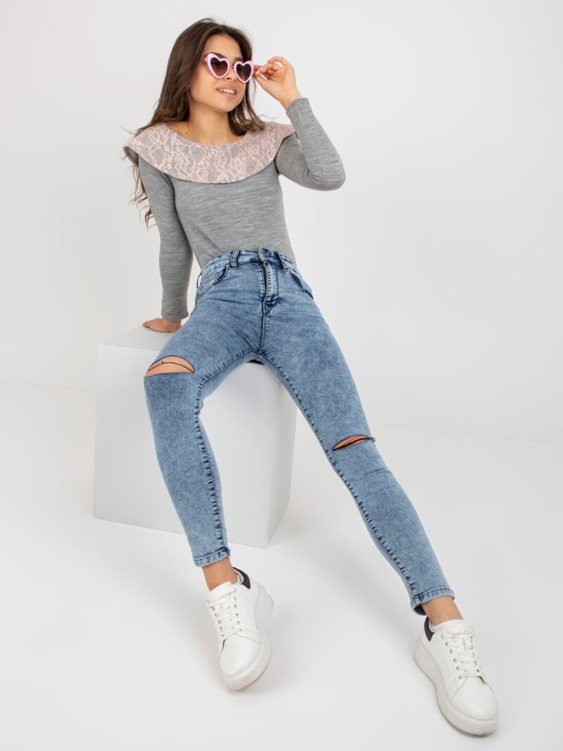 Niebieskie jeansy damskie z wysokim stanem i przetarciami