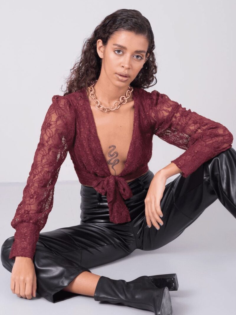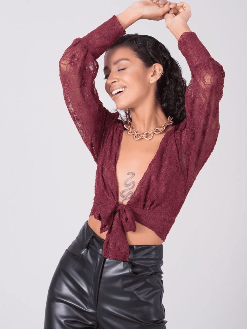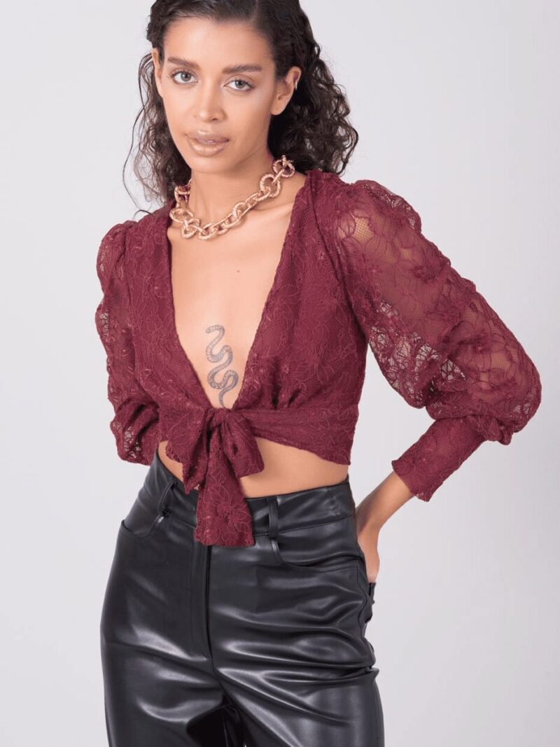 Bordowa koronkowa bluzka z wiązaniem
