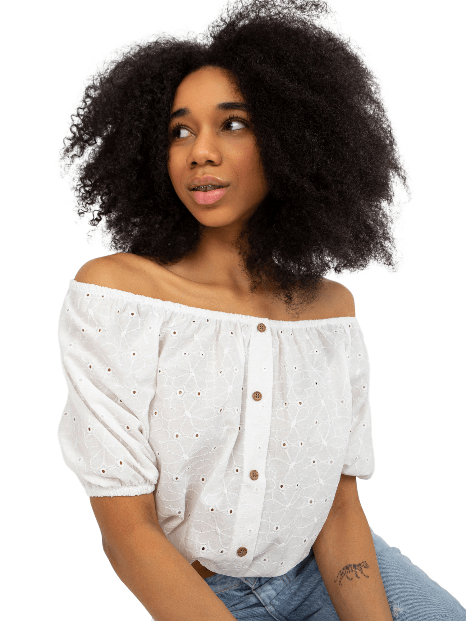 Bluzka hiszpanka z ażurowym haftem z pewnością przypadnie do gustu miłośniczkom stylu boho. Ta bluzka codzienna jest doskonałym wyborem na każdą okazję – niezależnie czy idziesz na spotkanie z przyjaciółmi, czy też na randkę z ukochanym. Dominujący ażurowy wzór dodaje bluzce elegancji i delikatności, a krótki rękaw oraz odkryte ramiona podkreślają kobiecość i dodają lekkości. Bluzka ta wykonana jest z wysokiej jakości bawełny, dzięki czemu jest przyjemna w dotyku i zapewnia wygodę noszenia.